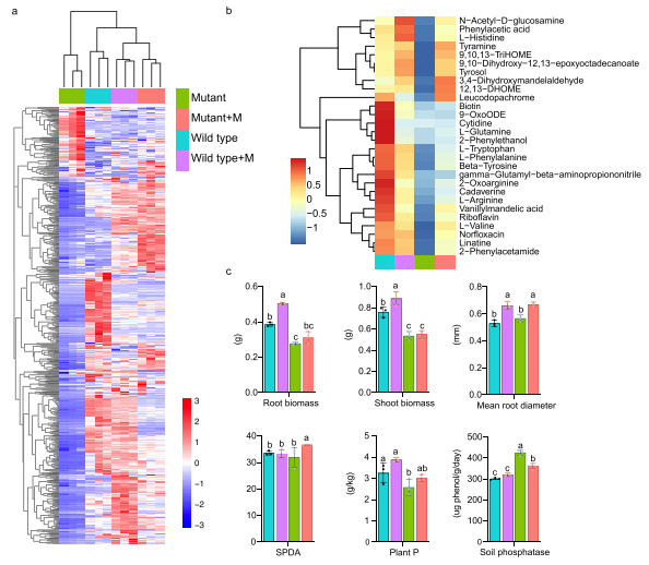 研究发现,根毛缺失导致玉米生物量和产量分别下降至野生型的30%和25%,叶片磷含量显著降低31.2%。同时,根毛缺失显著改变了根际和根内微生物群落结构,其中有益真菌被孢霉的相对丰度在无根毛突变体根际中下降了超过80%,且与多种下调的根系分泌物密切相关。代谢组分析显示,突变体根系分泌物中约75%的代谢物丰度下调,尤其是与被孢霉招募相关的关键代谢物如3,4-二羟基扁桃醛等显著减少。玉米突变体可通过上调根内固氮细菌的丰度及宿主铁氧还蛋白硝酸盐还原酶基因的表达,部分补偿了氮素吸收的不足。然而,这种内源补偿机制不足以弥补磷素缺乏带来的生长限制。