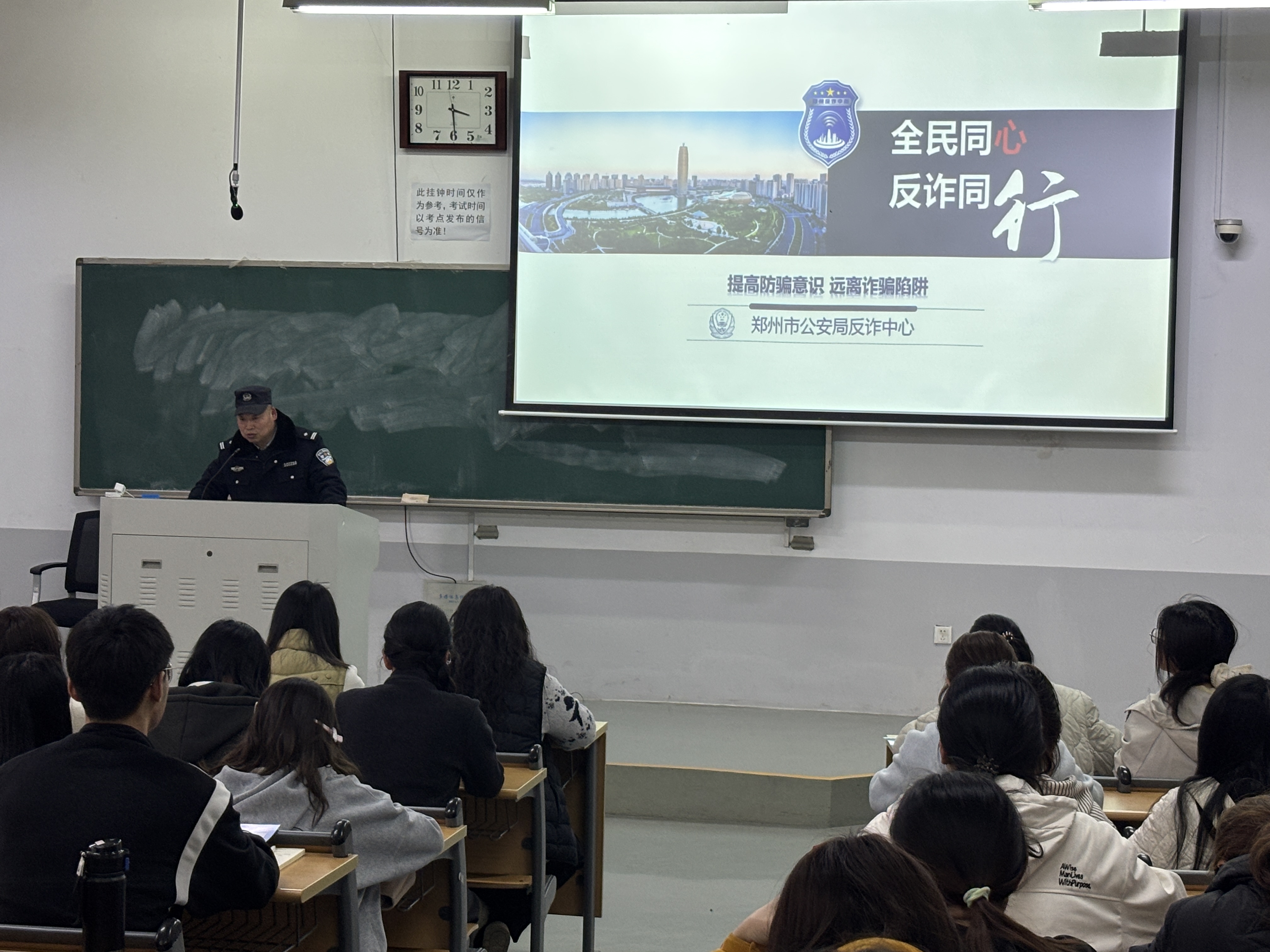 联合保卫处于繁塔楼D102教室举行“强化反诈宣传教育,共建平安文明校园”网络反诈主题安全教育。郑东新区公安分局及龙子湖派出所的郑警官应邀担任主讲,各年级宿舍长参与此次主题教育。
